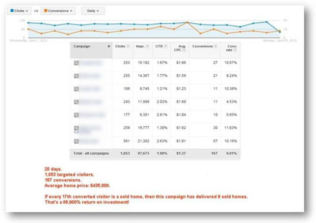 It’s true. Have a look at this screen shot from a campaign we’re running for another homebuilder. With the majority of these campaigns converting in double-digit territory, this builder is enjoying a robust 86,000% return on marketing investment – in only one specific channel – over only a 3-week period.
